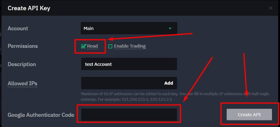7. Click "Create API" and copy paste the API Keys into TradeStream<br>