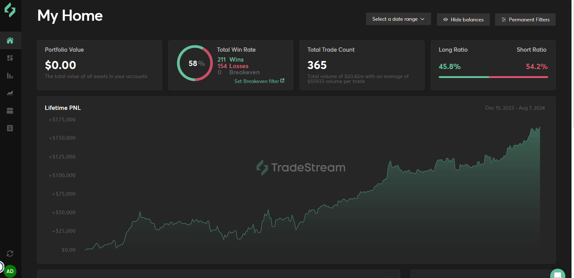 **Example:** You trade a $100 000 account and when you exit trades at that win or lose you less than $10 you don't want to count them towards your wins or losses. So you set a Breakeven filter for $10 and now all trades that lose or win less than $10 are ignored for win rate statistics