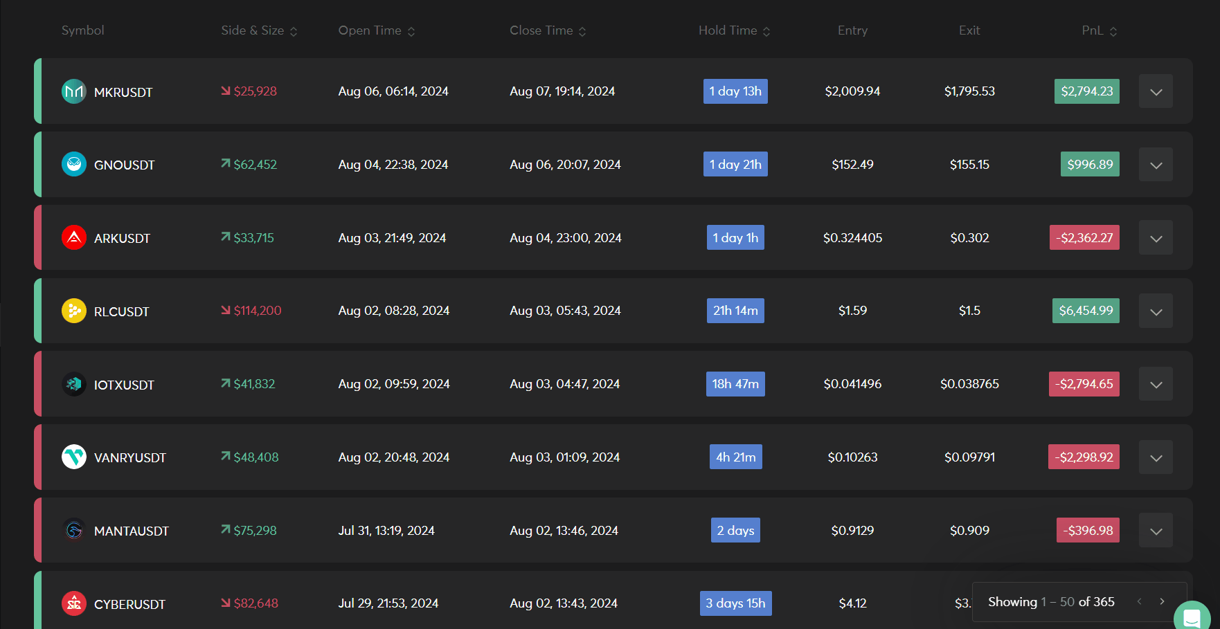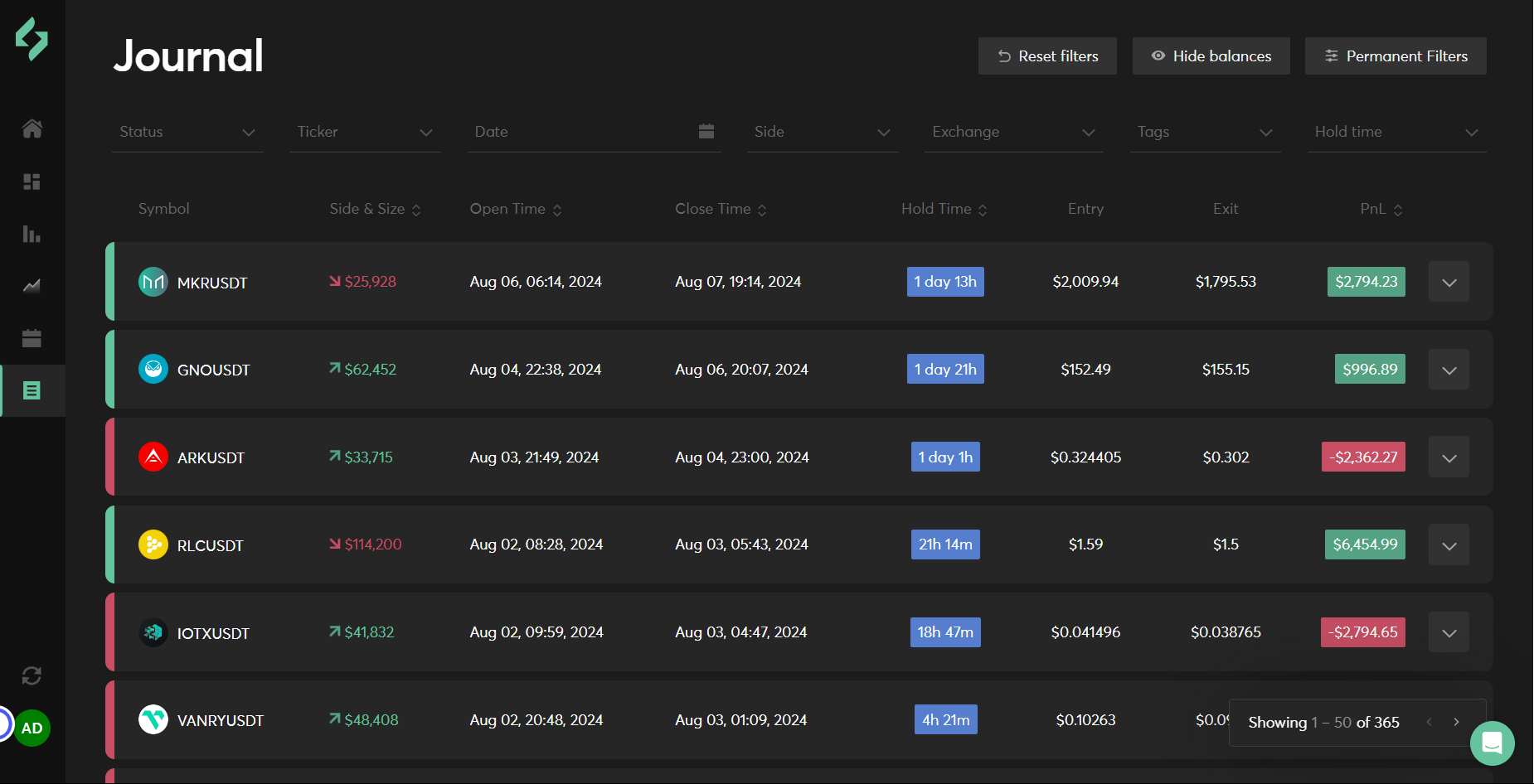 On the Journalling page you will be able to see all of your closed trades with some important info for each such as trade size, open/close times hold time, average entry/exit price and profit/loss per trade.